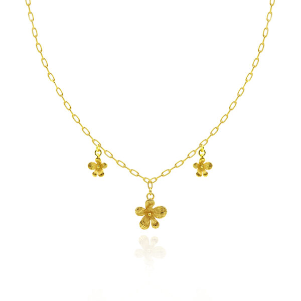 Subtelny, kobiecy i pełen blasku – ten pozłacany naszyjnik z trzema wiszącymi kwiatuszkami to delikatna ozdoba, która przyciąga spojrzenia. Wykonany z najwyższej jakości srebra 925, pokryty szlachetną warstwą złota, osadzony został na klasycznym łańcuszku o splocie ankier, który pięknie układa się na dekolcie.