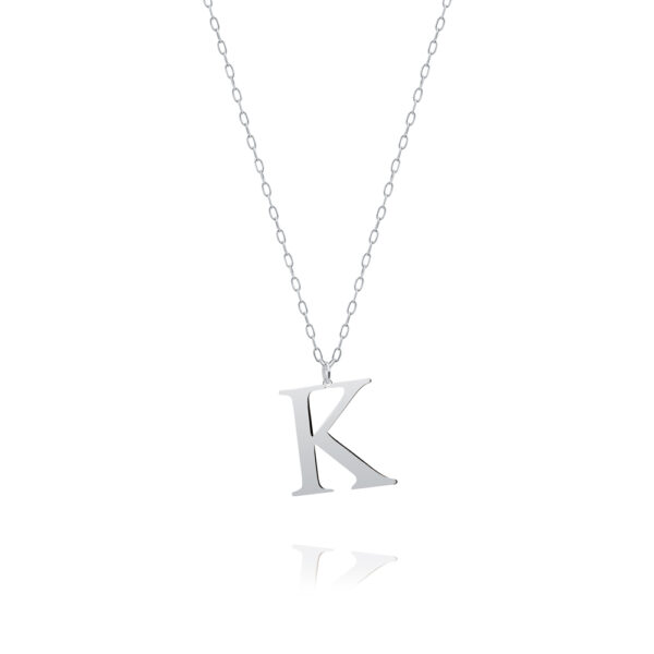 Naszyjnik z literką K srebrny. Biżuteria modowa wykonana z najwyższej próby srebra 925 – bez dodatku niklu, nie uczula. Naszyjnik dodatkowo uszlachetniony 3 warstwami szlachetnego rodu. Wielkość litery K: 18×18 mm. Literka K o strukturze gładkiej, polerowanej i błyszczącej, zawieszona na łańcuszku o splocie typu ankier, regulowanym o długości od 44 do 49 cm. Splot ankier o owalnych oczkach jest jednym z najmocniejszych splotów, odpornym na zerwania oraz uszkodzenia. Wyrób jubilerski wysokiej jakości wykonany przez mistrzów jubilerstwa z ogromną precyzją oraz dbałością o detale.