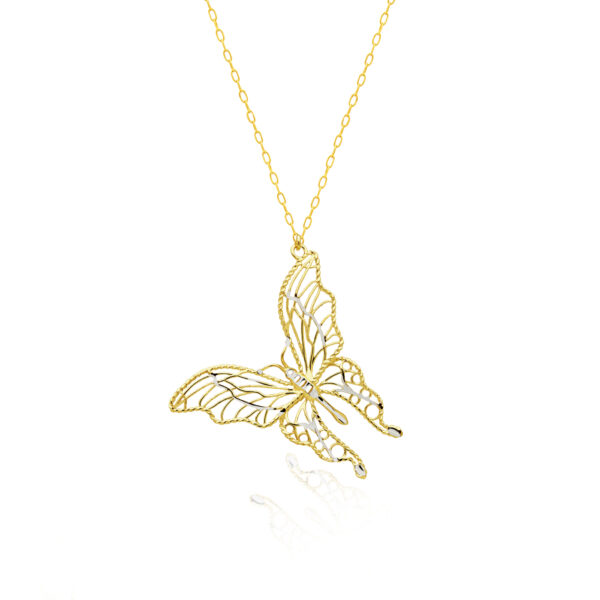 Naszyjnik z motylem srebrny pozłacany wykonany z najwyższej próby srebra 925 – bez niklu, nie uczula. Biżuteria dodatkowo pokryta 3 warstwami 24 karatowego złota. Naszyjnik składa się z łańcuszka o splocie rolo o regulowanej długości 38-43 cm oraz zawieszki motyla o wysokości; 33 mm, szerokości 33 mm. Wyrób jubilerski wysokiej jakości wykonany przez mistrzów jubilerstwa z ogromną precyzją oraz dbałością o detale.