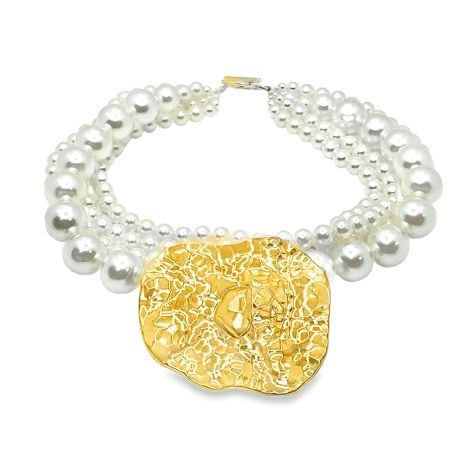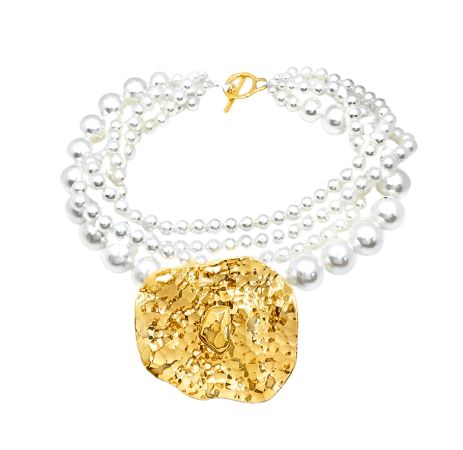 Naszyjnik z perłami i młotkowaną zawieszką – stal szlachetna to wyrazista kompozycja oparta na czterech rzędach pereł o zróżnicowanej gradacji. Centralnym punktem jest masywna zawieszka o nieregularnej, młotkowanej fakturze, która kontrastuje z gładką powierzchnią kul. Precyzyjna konstrukcja i zapięcie typu toggle podkreślają nowoczesny, rzeźbiarski charakter biżuterii.