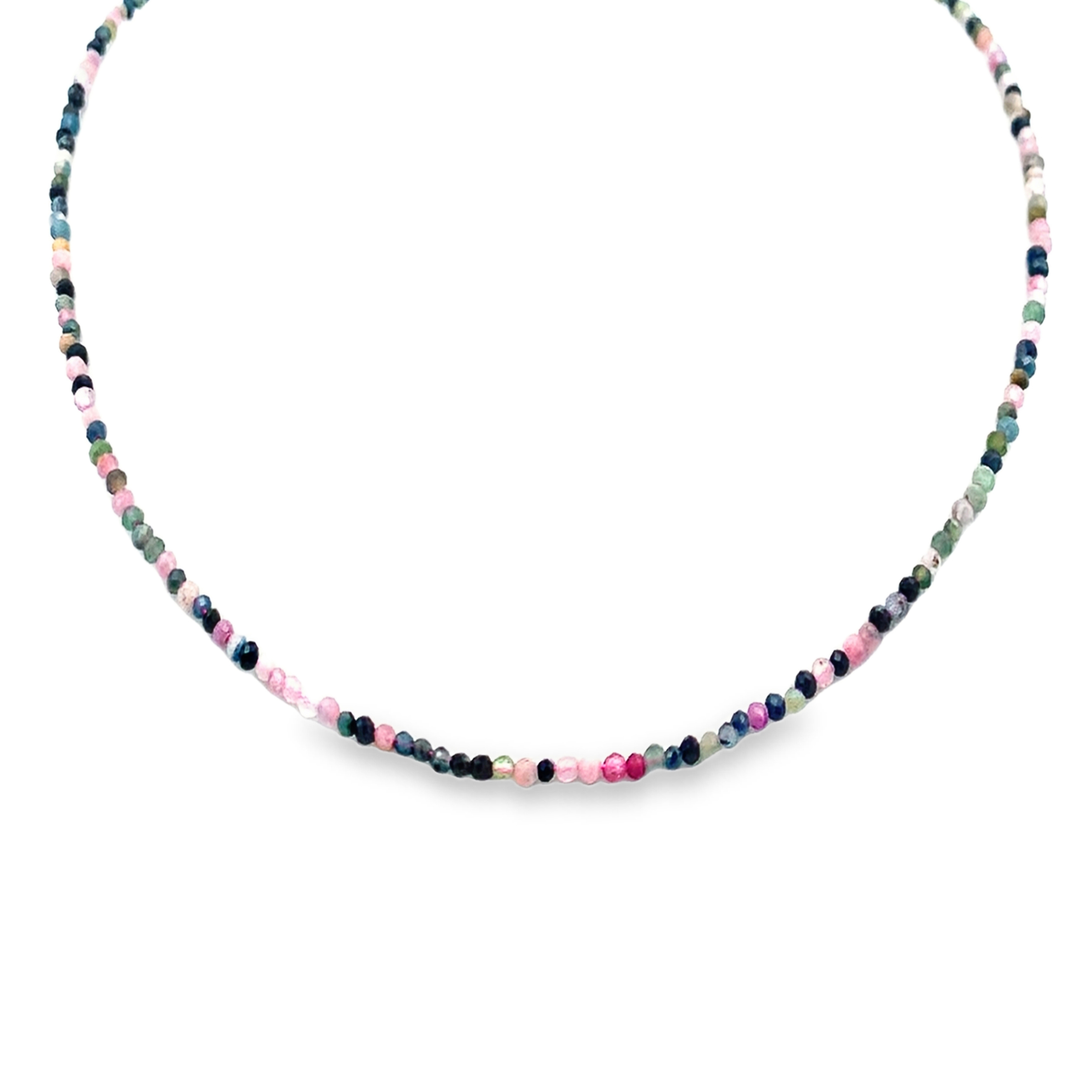 Ten delikatny naszyjnik z turmalinami łączy w sobie naturalne piękno kamieni z subtelnym, wielobarwnym akcentem, idealnym dla osób ceniących elegancję i indywidualny styl. Każdy fasetowany turmalin prezentuje bogatą paletę barw – od pudrowego różu, intensywnego malinowego, przez turkusowe i głębokie zielone odcienie, po granat, niemal czarny oraz transparentne i jasnożółte akcenty.