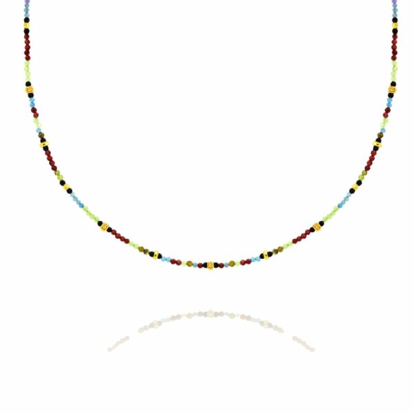Naszyjnik z turmalinem, kwarcem, onyksem srebrny pozłacany wykonany z najwyższej próby srebra 925 – bez dodatku niklu, nie uczula. Naszyjnik o regulowanej długości: 40-43,5 cm. Precioza ozdobiona turmalinem, kwarcem, onyksem. Wyrób jubilerski wysokiej jakości wykonany przez mistrzów jubilerstwa z ogromną precyzją oraz dbałością o detale.