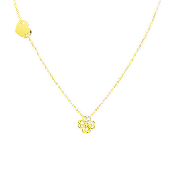 Naszyjnik wykonany ze Złota Próby 585. Długość naszyjnika: 41,5-44,5 cm. Naszyjnik ozdobiony zawieszkami w serca oraz koniczyny. Naszyjnik przepięknie układa się na szyi. Złoty Naszyjnik z sercem i koniczyną przepięknie podkreśli Twój styl nadając mu subtelności oraz niepowtarzalnej lekkości. Biżuteria świetnie nada się do codziennych stylizacji jak również na specjalne okazje.