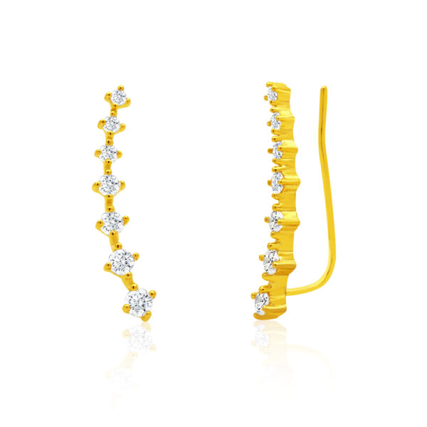 Nausznica ozdobiona cyrkoniami srebrna pozłacana wykonana z najwyższej próby srebra 925 – bez niklu, nie uczula. Biżuteria dodatkowo pokryta 3 warstwami 24 karatowego złota. Wysokość kolczyków: 28mm. Nausznice ozdobione cyrkoniami o szlifie brylantowym o przejrzystości: AAAAA+, klasa pierwsza. Wysokiej klasy cyrkonia nadaje delikatny błyszczący efekt. Wyrób jubilerski wykonany z ogromną precyzją przez mistrzów jubilerstwa.
