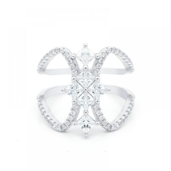 Pierścionek wykonany ze srebra uszlachetnionego rodem próby 925. Pierścionek bogato ozdobiony białą cyrkonią. Szerokość pierścionka 2 cm.