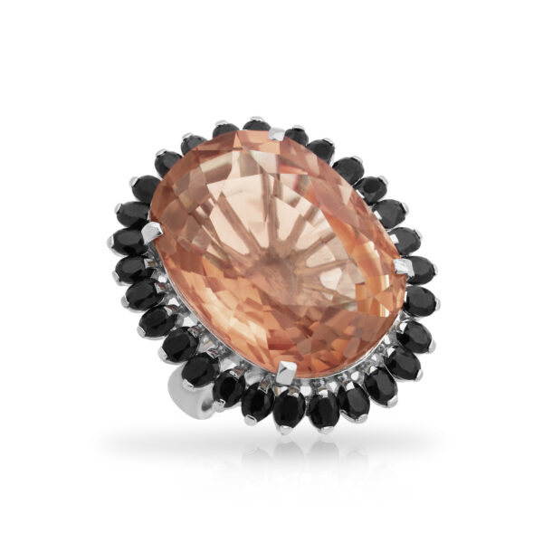 Pierścionek ozdobiony dużym kwarcem dymnym i szafirami srebrny wykonany z najwyższej próby srebra 925 – bez niklu, nie uczula. Biżuteria dodatkowo pokryta 3 warstwami szlachetnego rodu. Pierścionek ozdobiony naturalnym kwarcem dymnym o szlifie owalnym o wielkości: 15×27 mm. Wielkość kamieni szafirów: 2x4mm. Wyrób jubilerski wysokiej jakości wykonany przez mistrzów jubilerstwa z ogromną precyzją oraz dbałością o detale.