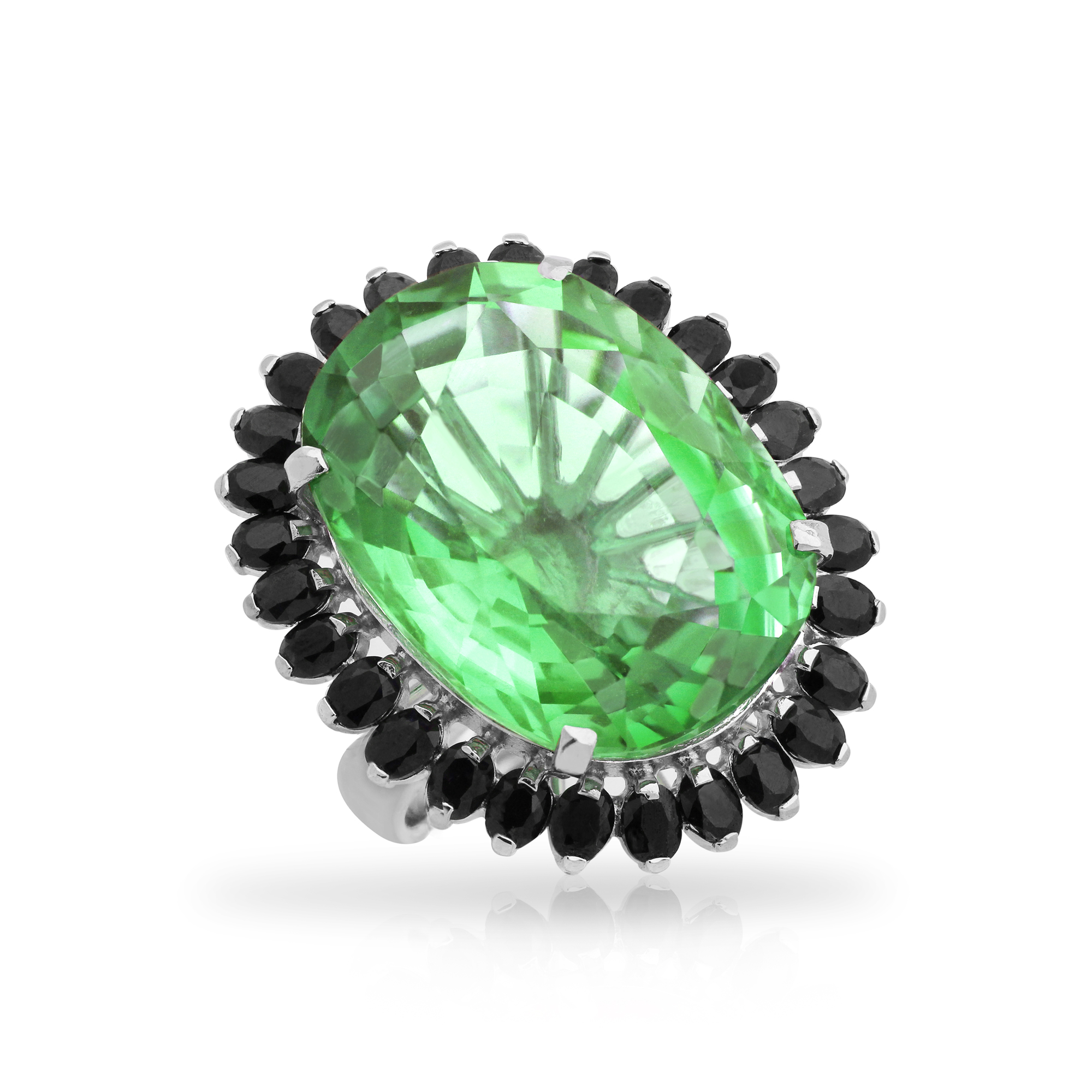 Pierścionek ozdobiony dużym zielonym topazem i szafirami srebrny wykonany z najwyższej próby srebra 925 – bez niklu, nie uczula. Biżuteria dodatkowo pokryta 3 warstwami szlachetnego rodu. Pierścionek ozdobiony naturalnym zielonym topazem o szlifie owalnym o wielkości: 18×22 mm. Wielkość kamieni szafirów: 2x4mm. Wyrób jubilerski wysokiej jakości wykonany przez mistrzów jubilerstwa z ogromną precyzją oraz dbałością o detale