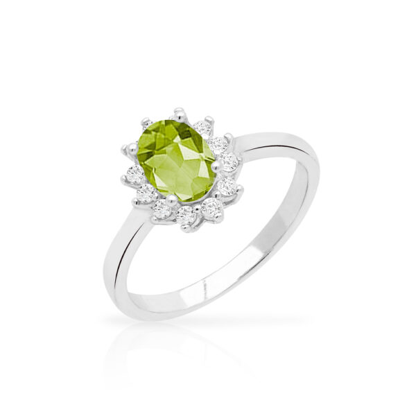 Pierścionek srebrny ozdobiony oliwinem w eleganckiej oprawie wykonany z najwyższej próby srebra 925 – bez niklu, nie uczula. Biżuteria dodatkowo pokryta 3 warstwami szlachetnego rodu. Pierścionek ozdobiony naturalnym oliwinem o szlifie owalnym o wielkości 5x7mm i cyrkoniami. Wyrób jubilerski wysokiej jakości wykonany przez mistrzów jubilerstwa z ogromną precyzją oraz dbałością o detale.