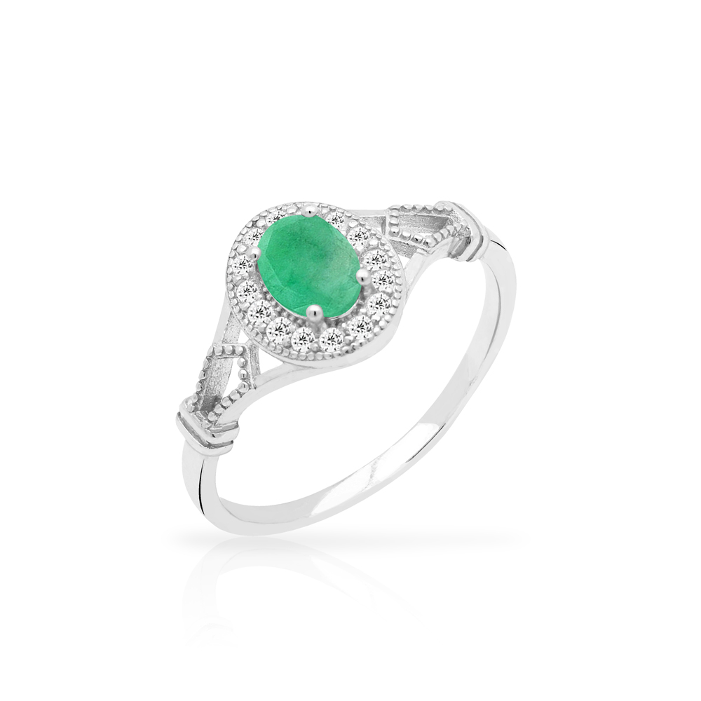 Pierścionek srebrny ozdobiony szmaragdem i cyrkoniami wykonany z najwyższej próby srebra 925 – bez niklu, nie uczula. Biżuteria dodatkowo pokryta 3 warstwami szlachetnego rodu. Pierścionek ozdobiony naturalnym szmaragdem o szlifie owalnym o wielkości 5x7mm oraz cyrkoniami. Wyrób jubilerski wysokiej jakości wykonany przez mistrzów jubilerstwa z ogromną precyzją oraz dbałością o detale.