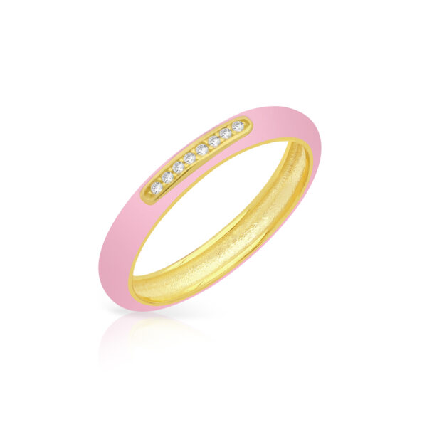 Pierścionek srebrny pozłacany z różową emalią i cyrkoniami wykonany z najwyższej próby srebra 925 – bez niklu, nie uczula. Biżuteria dodatkowo pokryta 3 warstwami 24 karatowego złota. Biżuteria modowa ozdobiona różową pastelową emalią jubilerską oraz cyrkoniami o przejrzystości: AAAAA+, klasa pierwsza. Wysokiej klasy cyrkonia nadaje delikatny błyszczący efekt. Wyrób jubilerski wykonany z ogromną precyzją przez mistrzów jubilerstwa.