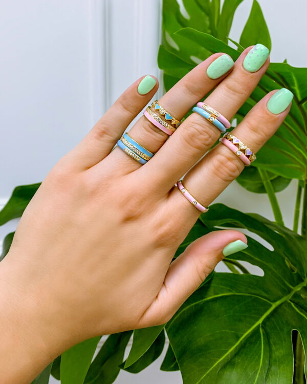 Pierścionek nadaje wyrazistości oraz wiosenno-letniego akcentu, prześlicznie ozdabiając dłoń. Biżuteria z kolorową emalią jubilerską stała się ulubionym dodatkiem blogerów oraz influencerów czyniąc ją prawdziwym hitem. Pierścionka nie może zabraknąć w Twojej kolekcji biżuterii. Kolorowy pierścionek wygląda rewelacyjnie noszony samodzielnie lub w zestawieniu z innymi pierścionkami dostępnymi w naszym sklepie.