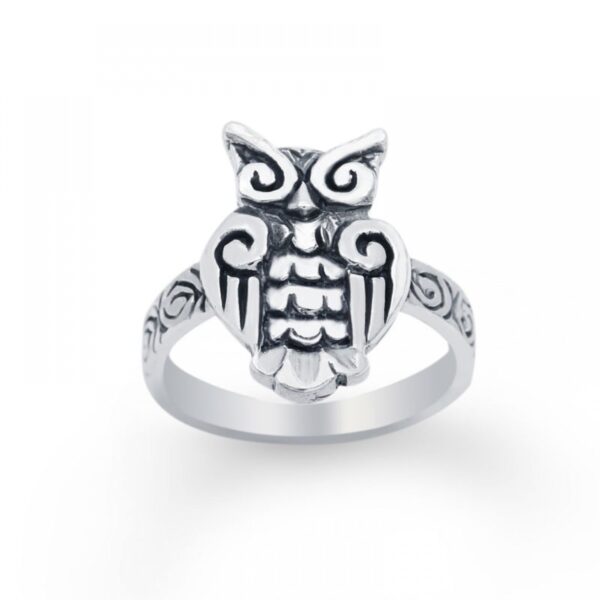 Pierścionek wykonany ze srebra oksydowanego próby 925. Szerokość części ozdobnej: 17 mm.