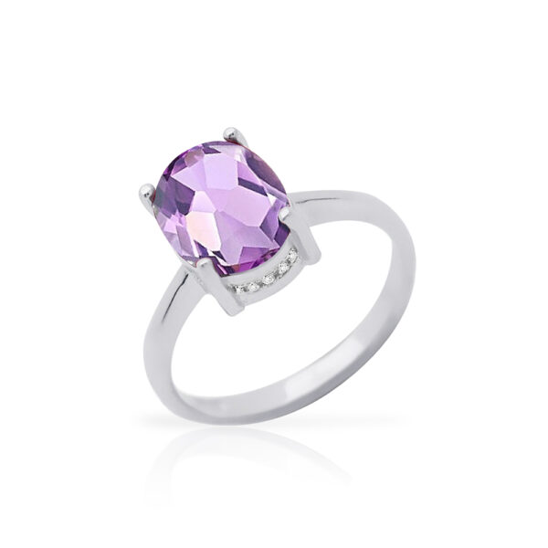 Pierścionek srebrny z ametystem i delikatnymi cyrkoniami wykonany z najwyższej próby srebra 925 – bez niklu, nie uczula. Biżuteria dodatkowo pokryta 3 warstwami szlachetnego rodu. Pierścionek ozdobiony naturalnym ametystem o szlifie owalnym o wielkości 8x10mm oraz cyrkoniami. Wyrób jubilerski wysokiej jakości wykonany przez mistrzów jubilerstwa z ogromną precyzją oraz dbałością o detale.