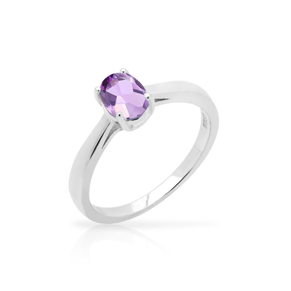 Pierścionek srebrny z ametystem subtelny wykonany z najwyższej próby srebra 925 – bez niklu, nie uczula. Biżuteria dodatkowo pokryta 3 warstwami szlachetnego rodu. Pierścionek ozdobiony naturalnym ametystem o szlifie owalnym o wielkości 5x7mm. Wyrób jubilerski wysokiej jakości wykonany przez mistrzów jubilerstwa z ogromną precyzją oraz dbałością o detale.