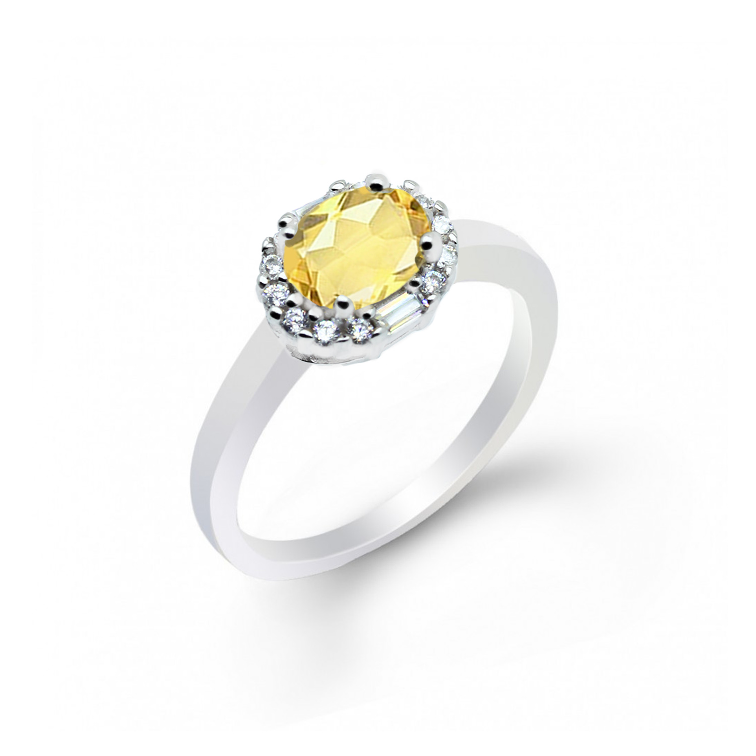 Pierścionek srebrny z cytrynem zachwyca intensywną, słoneczną barwą kamienia i elegancką, bogato zdobioną koroną. Owalny cytryn w fasetowym szlifie otoczony jest bezbarwną aureolą kamieni bagietowych i brylantowych, które podkreślają luksusowy charakter biżuterii. Gładka, polerowana obrączka zapewnia komfort i ponadczasowy styl.