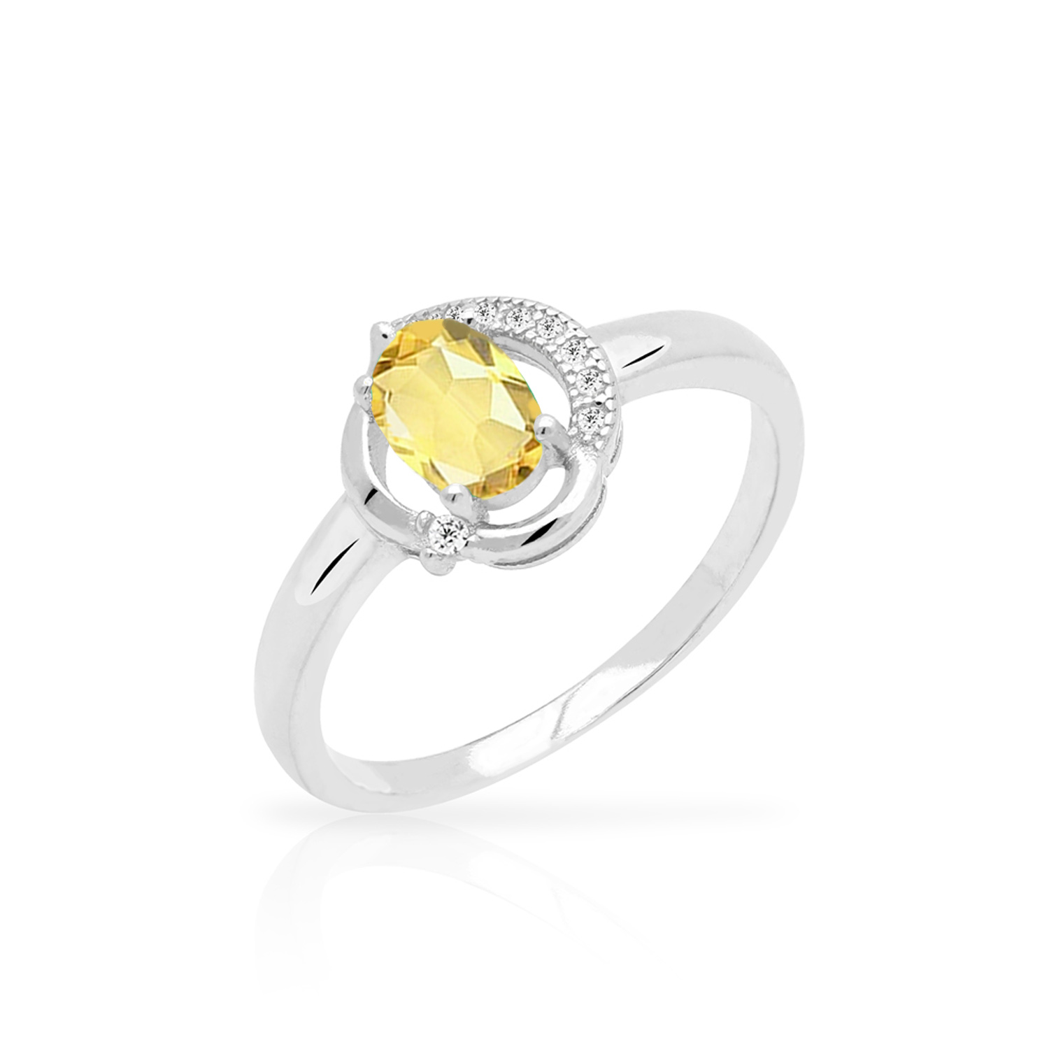 Pierścionek srebrny z cytrynem to elegancka biżuteria o ażurowej, łezkowej konstrukcji. Owalny, jasnożółty cytryn w czterech łapkach otoczony jest drobnymi, błyszczącymi kamieniami, a całość wykonano z polerowanego srebra próby 925, pokrytego rodem. Idealny jako wyrafinowany dodatek i symbol radości oraz pozytywnej energii.