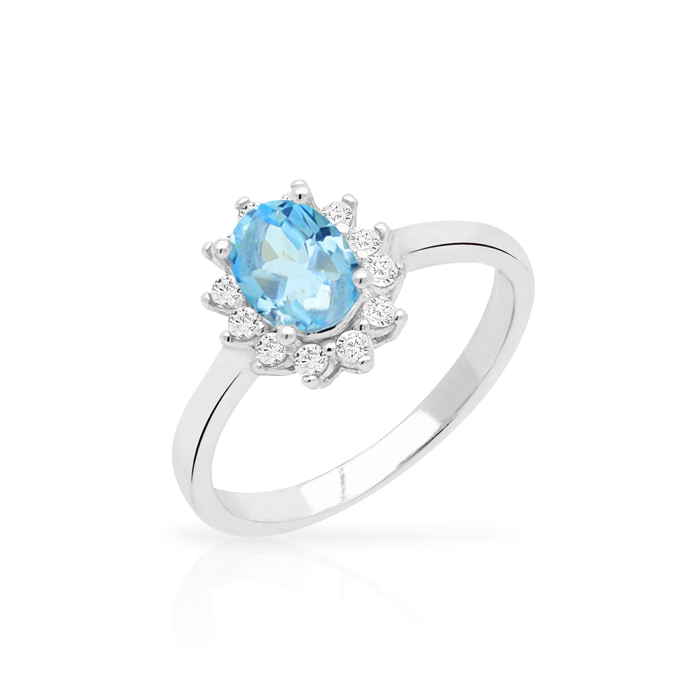 Pierścionek srebrny z niebieskim topazem w eleganckiej oprawie wykonany z najwyższej próby srebra 925 – bez niklu, nie uczula. Biżuteria dodatkowo pokryta 3 warstwami szlachetnego rodu. Pierścionek ozdobiony naturalnym niebieskim topazem o szlifie owalnym o wielkości 5x7mm oraz cyrkoniami. Wyrób jubilerski wysokiej jakości wykonany przez mistrzów jubilerstwa z ogromną precyzją oraz dbałością o detale.