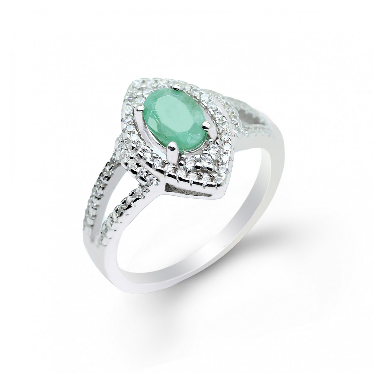 Pierścionek srebrny z szmaragdem o kształcie markizy zachwyca intensywną zielenią kamienia i podwójną oprawą halo z bezbarwnych akcentów. Szyna typu split shank wysadzana pave dodaje mu nowoczesnej elegancji. To luksusowy dodatek, który podkreśli kobiecy styl i doda klasy każdej stylizacji.