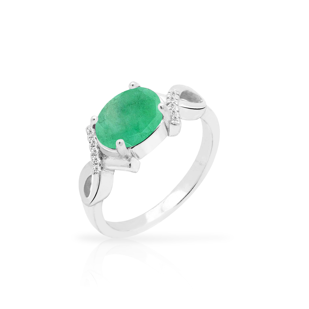 Pierścionek srebrny ze szmaragdem i cyrkoniami wykonany z najwyższej próby srebra 925 – bez niklu, nie uczula. Biżuteria dodatkowo pokryta 3 warstwami szlachetnego rodu. Pierścionek ozdobiony naturalnym szmaragdem o szlifie owalnym o wielkości 7x9mm oraz cyrkoniami. Wyrób jubilerski wysokiej jakości wykonany przez mistrzów jubilerstwa z ogromną precyzją oraz dbałością o detale.