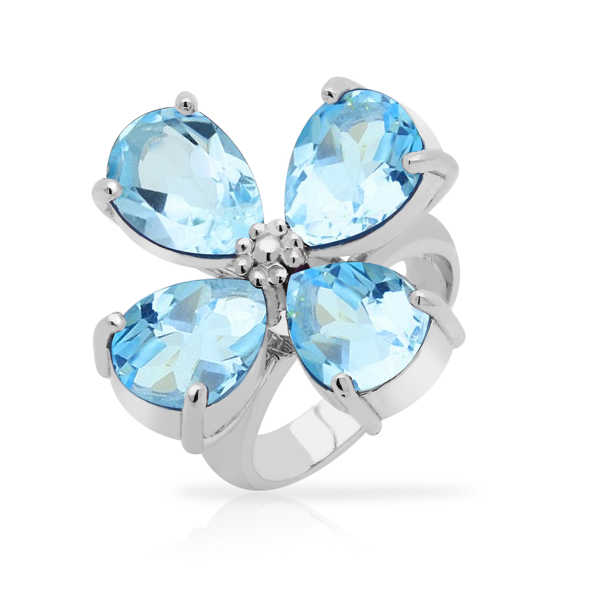 Pierścionek wysadzany niebieskimi topazami kwiatuszek srebrny wykonany z najwyższej próby srebra 925 – bez niklu, nie uczula. Biżuteria dodatkowo pokryta 3 warstwami szlachetnego rodu. Pierścionek ozdobiony naturalnymi niebieskimi topazami o szlifie migdał o wielkości: 8x10mm. Wielkość elementu ozdobnego – kwiatuszka – 25mm. Wyrób jubilerski wysokiej jakości wykonany przez mistrzów jubilerstwa z ogromną precyzją oraz dbałością o detale.