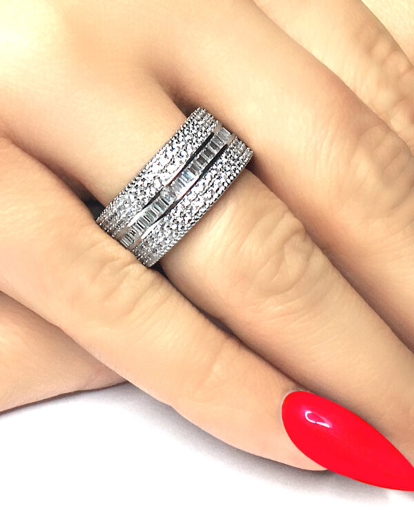 Pierścionek wykonany ze srebra próby 925, dodatkowo uszlachetniony warstwą rodu, bogato zdobiony cyrkonią.