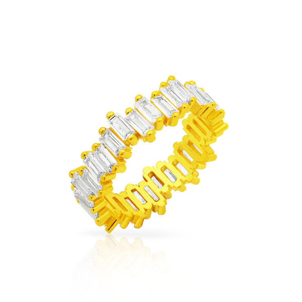 Pierścionek z cyrkoniami srebrny pozłacany obrączka nieregularna wykonany z najwyższej próby srebra 925 – bez niklu, nie uczula. Biżuteria dodatkowo pokryta 3 warstwami 24 karatowego złota. Precioza bogato ozdobiona cyrkoniami o szlifie bagietka o wymiarach: 2x4mm. Wysokiej klasy cyrkonie o przejrzystości: AAAAA+, klasa pierwsza, nadają delikatny błyszczący efekt. Wyrób jubilerski wykonany z ogromną precyzją oraz dbałością o szczegóły przez mistrzów jubilerstwa.