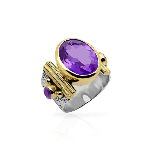Pierścionek z grawerowaną obrączką z ametystem srebrny wykonany z najwyższej próby srebra 925 – bez niklu, nie uczula. Biżuteria dodatkowo pokryta 3 warstwami szlachetnego rodu oraz 3 mikronami 24 karatowego złota. Pierścionek ozdobiony naturalnym ametystem o szlifie owalnym o wielkości 12×16 mm oraz mniejsze o średnicy 4 mm. Wyrób jubilerski wysokiej jakości wykonany przez mistrzów jubilerstwa z ogromną precyzją oraz dbałością o detale.