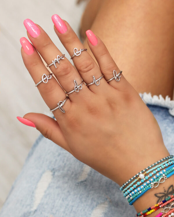 Pierścionek z literką A srebrny. Biżuteria modowa wykonana z najwyższej próby srebra 925 – bez niklu, nie uczula. Pierścionek dodatkowo uszlachetniony 3 warstwami szlachetnego rodu. Pierścionek posiada regulowany rozmiar.