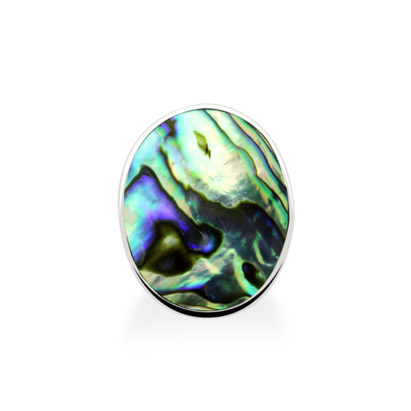 Pierścionek z masą perłową ciemną owalny gładki wykonany z najwyższej próby srebra 925 – bez dodatku niklu, nie uczula. Biżuteria dodatkowo uszlachetniona 3 warstwami rodu. Pierścionek ozdobiony naturalną masą perłową. Wielkość oczka: 24×30 mm.
