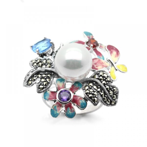 Pierścionek wykonany ze srebra uszlachetnionego rodem próby 925. Pierścionek ozdobiony perłą Swarovskiego, markazytem, kolorową cyrkonią oraz emalią jubilerską. Średnica perły 12 mm. Wielkość części ozdobnej 35×30 mm.