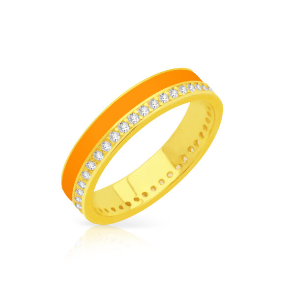 Pierścionek z pomarańczową emalią oraz cyrkoniami srebrny pozłacany wykonany z najwyższej próby srebra 925 – bez niklu, nie uczula. Biżuteria dodatkowo pokryta 3 warstwami 24 karatowego złota. Biżuteria modowa ozdobiona pomarańczową emalią jubilerską oraz cyrkoniami o przejrzystości: AAAAA+, klasa pierwsza. Wysokiej klasy cyrkonia nadaje delikatny błyszczący efekt. Wyrób jubilerski wykonany z ogromną precyzją przez mistrzów jubilerstwa.