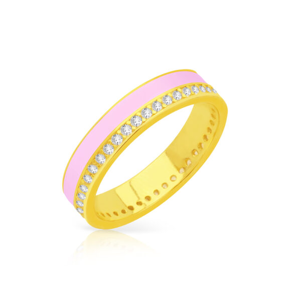 Pierścionek z różową emalią oraz cyrkoniami srebrny pozłacany wykonany z najwyższej próby srebra 925 – bez niklu, nie uczula. Biżuteria dodatkowo pokryta 3 warstwami 24 karatowego złota. Biżuteria modowa ozdobiona różową emalią jubilerską oraz cyrkoniami o przejrzystości: AAAAA+, klasa pierwsza. Wysokiej klasy cyrkonia nadaje delikatny błyszczący efekt. Wyrób jubilerski wykonany z ogromną precyzją przez mistrzów jubilerstwa.