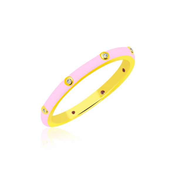Pierścionek z różową jasną emalią srebrny pozłacany wykonany z najwyższej próby srebra 925 – bez niklu, nie uczula. Biżuteria dodatkowo pokryta 3 warstwami 24 karatowego złota. Biżuteria modowa ozdobiona różową jasną emalią jubilerską oraz cyrkoniami o przejrzystości: AAAAA+, klasa pierwsza. Wysokiej klasy cyrkonia nadaje delikatny błyszczący efekt. Wyrób jubilerski wykonany z ogromną precyzją przez mistrzów jubilerstwa.