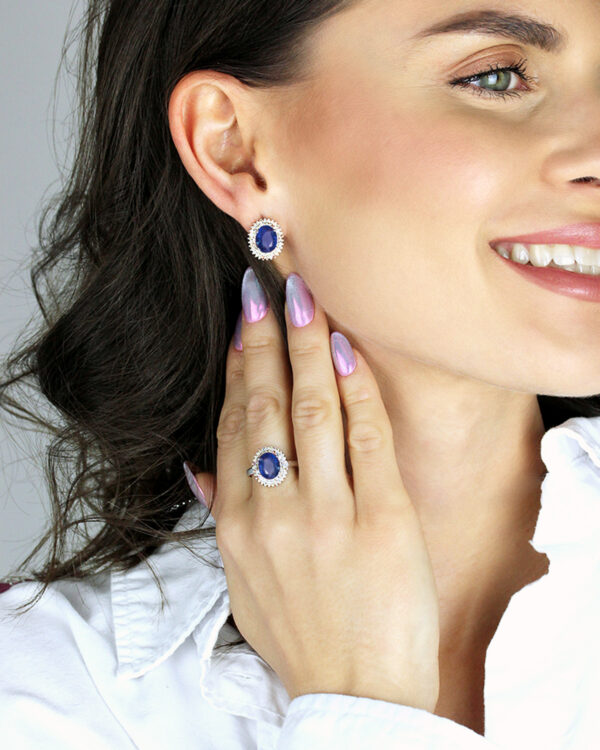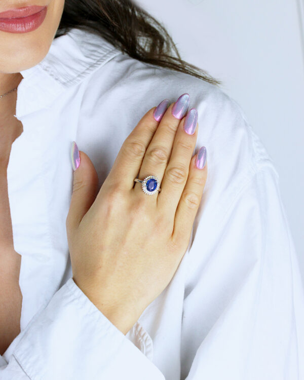 W samym centrum oprawy znajduje się naturalny szafir o szlifie fasetowym owalnym. Kamień ten wyróżnia się charakterystycznym, głębokim odcieniem granatu o niemal atramentowej tonacji. W strukturze minerału widoczne są typowe dla naturalnych szafirów inkluzje gazowo-płynne oraz subtelne pasmowanie barwne, które świadczą o jego naturalnym pochodzeniu.