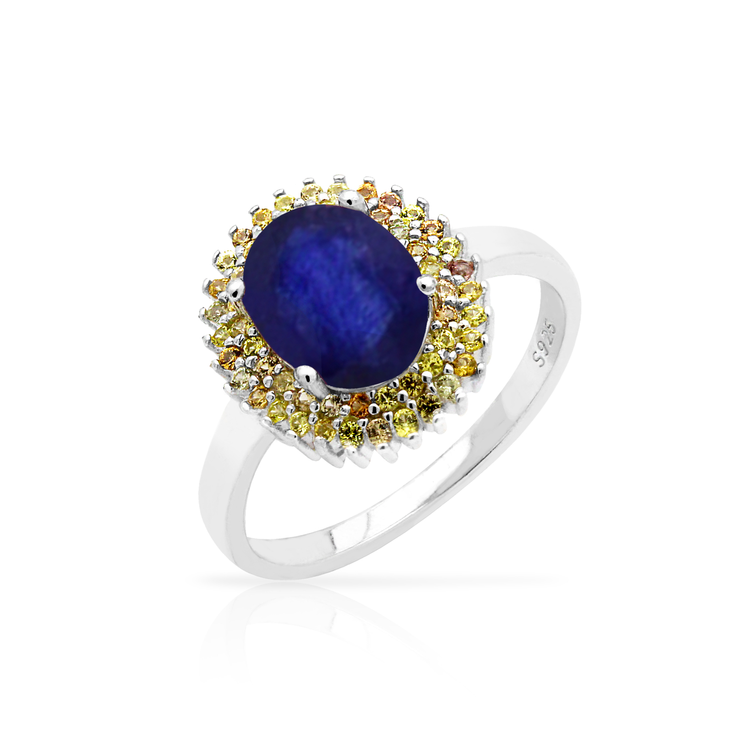 Pierścionek ozdobiony naturalnym niebieskim szafirem o szlifie owal o wymiarach: 6x8mm oraz żółtymi i pomarańczowymi szafirami o szlifie okrągłym o średnicy 1mm.