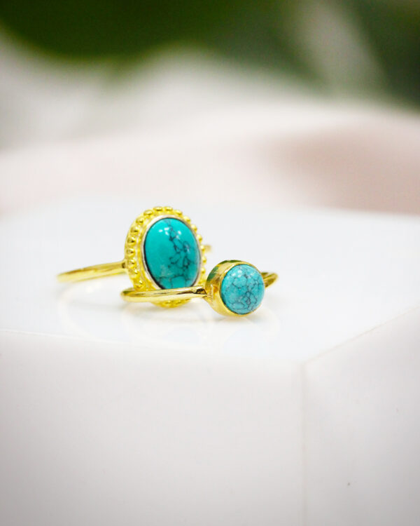 Pierścionek z turkusem srebrny pozłacany delikatny wykonany z najwyższej próby srebra 925 – bez dodatku niklu, nie uczula. Biżuteria dodatkowo pokryta 3 warstwami 24 karatowego złota. Pierścionek ozdobiony kamieniem naturalnym prasowanym turkusem. Średnica kamienia: 6mm.