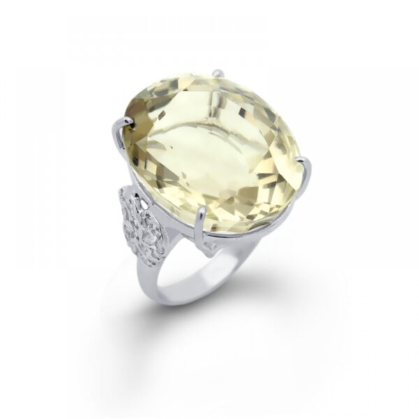 Pierścionek ozdobiony Zielonym Topazem o najwyższej klasie kamienia AAA, najwyższej jakości oraz o najwyższym stopniu przeźroczystości. Kamień o najdoskonalszym odcieniu bieli Barwy E. Jakość kamienia jest porównywalna z klasą diamentu o czystości VVS.