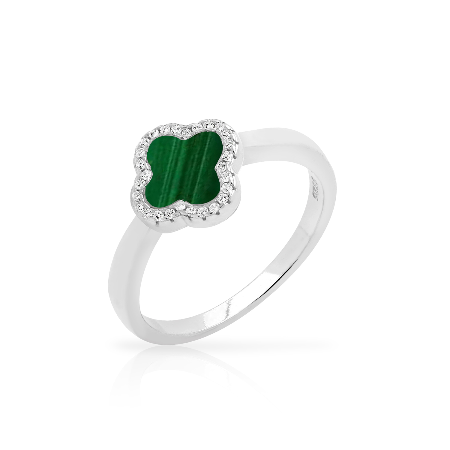 Pierścionek ze srebra o wyjątkowym designie, wzbudza zachwyt swoją elegancją i finezją. Jego wyjątkową cechą jest zielona koniczynka otoczona cyrkoniami.
