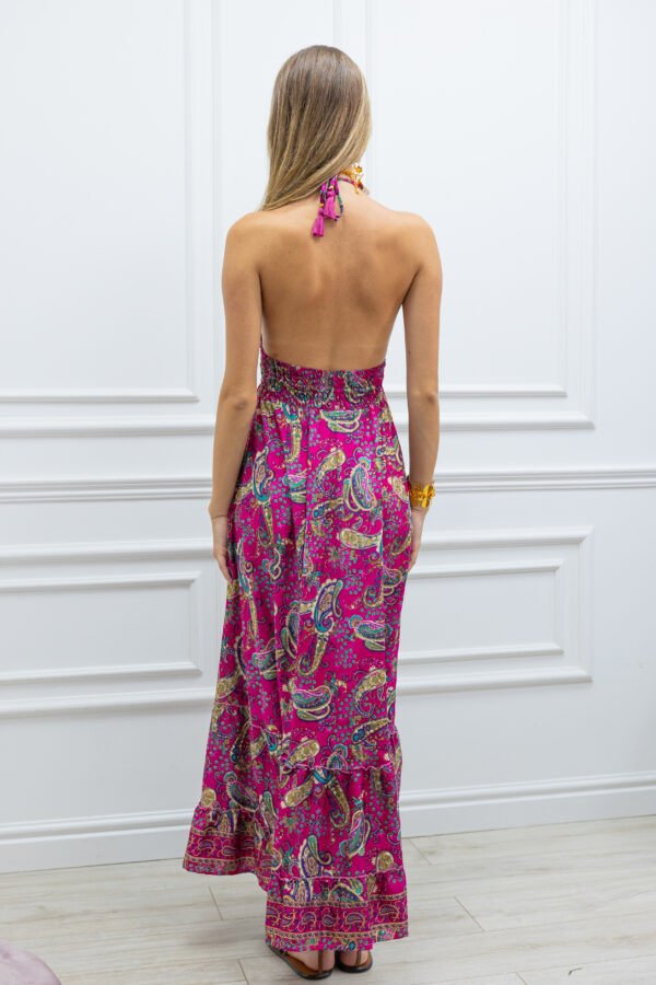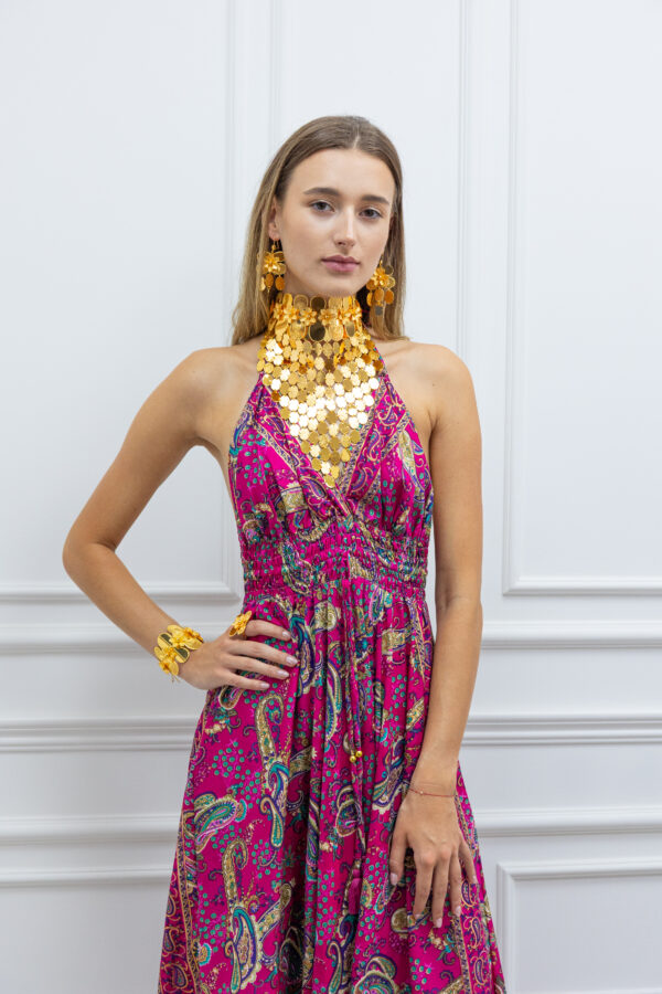 Sukienka jedwabna maxi w orientalny wzór-fuksja z akcentami złota