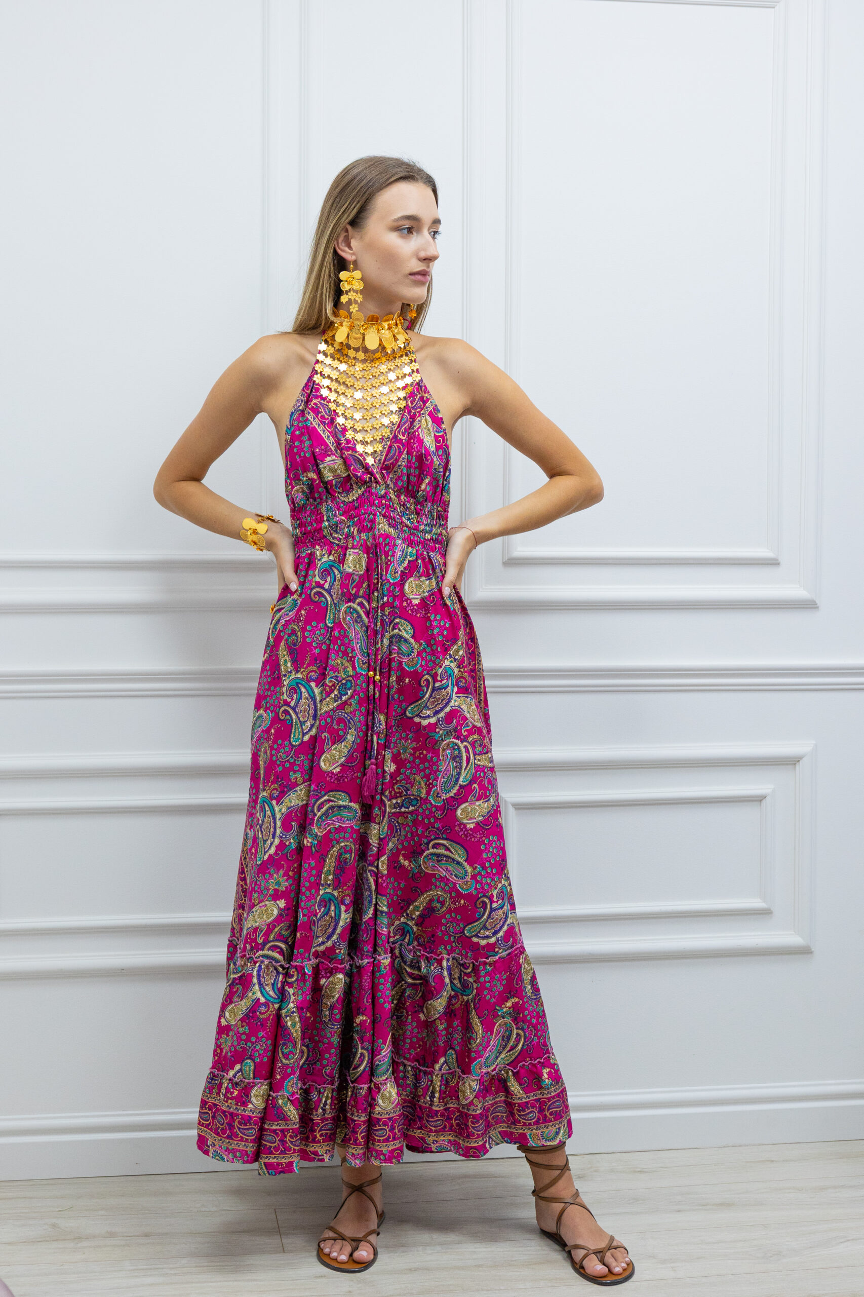 Sukienka jedwabna maxi w orientalny wzór-fuksja z akcentami złota