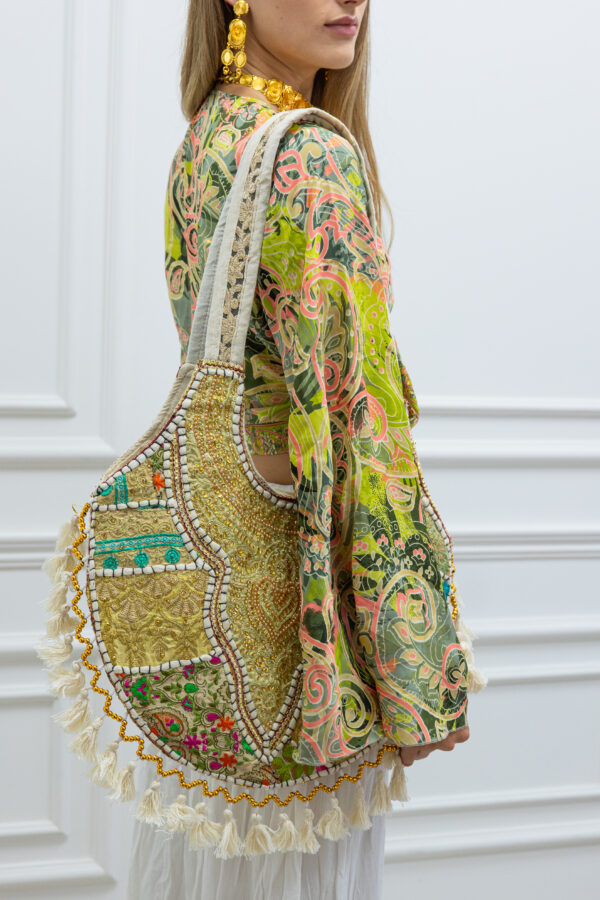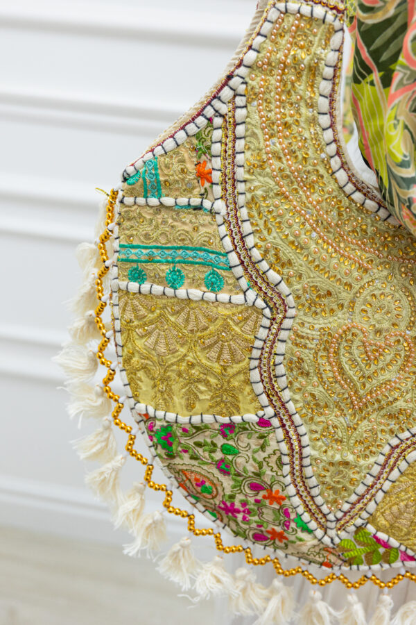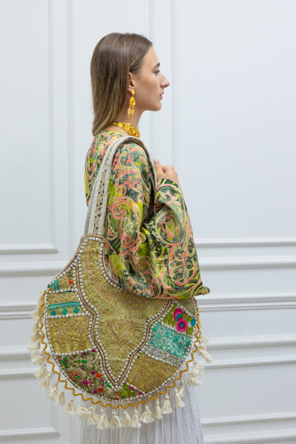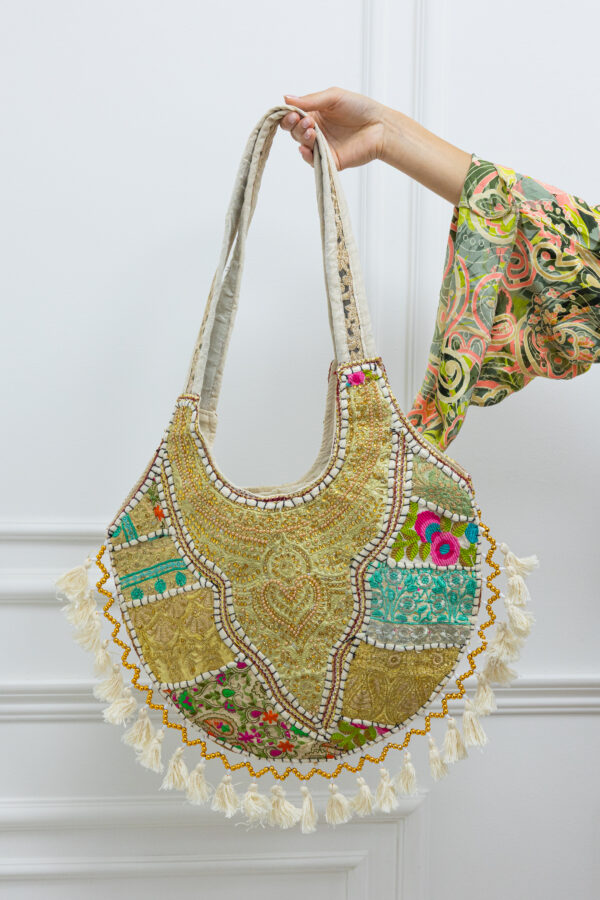 Poznaj jedyną w swoim rodzaju torebkę w stylu boho – ręcznie wykonaną z wysokiej jakości bawełny. Jej bogato zdobiony front zachwyca orientalnymi wzorami, haftami, koralikami i kolorowymi aplikacjami. Model w ciepłych odcieniach złota, beżu, turkusu i różu to idealny dodatek dla kobiet, które kochają modę z duszą.