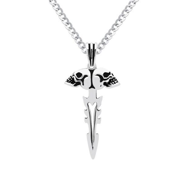 Zawieszka Sztylet z Czaszkami wykonana ze Srebra Próby 925. Zawieszka uszlachetniona czarnym rodem. Wielkość zawieszki: 25×55 mm. Zawieszka w kształcie Sztyletu z Czaszkami jest bardzo nietypową męską ozdobą. Zawieszka to świetny dodatek, który doda mężczyźnie pewności siebie i podkreśli indywidualny styl, nie tylko na co dzień. Zawieszka sprzedawana bez łańcuszka.