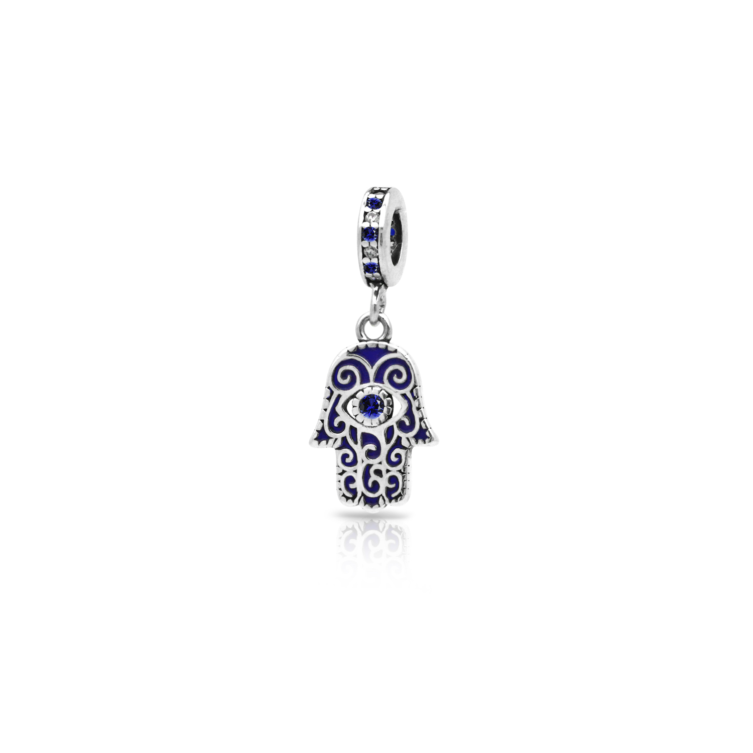 Zawieszka charms ręka fatimy srebrna wykonana z najwyższej próby srebra 925 – bez niklu, nie uczula. Biżuteria dodatkowo pokryta 3 warstwami szlachetnego rodu. Wysokość zawieszki: 27 mm. Zawieszka ręka fatimy ozdobiona cyrkoniami.