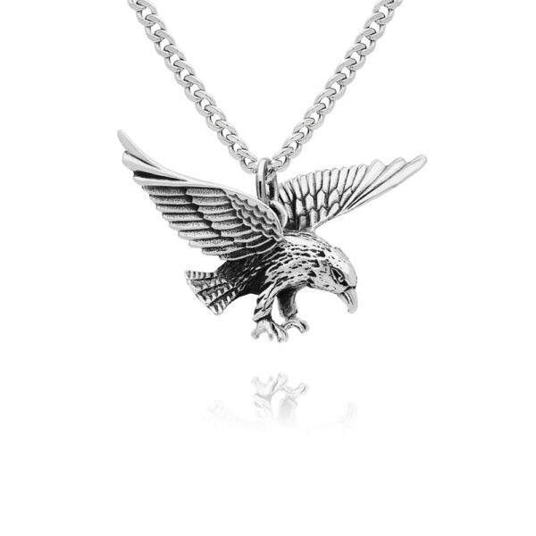 Zawieszka męska orzeł srebrna wykonana z najwyższej próby srebra 925 – bez niklu, nie uczula. Biżuteria oksydowana. Wielkość zawieszki: 34x22mm.