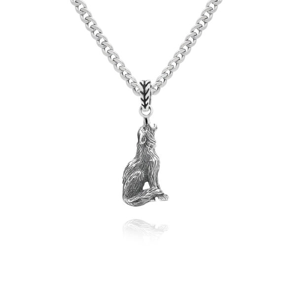 Zawieszka męska wyjący wilk srebrna wykonana z najwyższej próby srebra 925 – bez niklu, nie uczula. Biżuteria oksydowana. Wielkość zawieszki: 15x36mm.