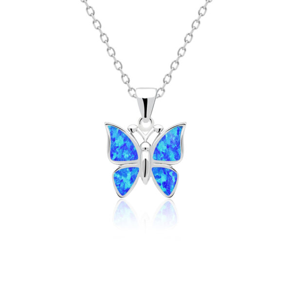 Zawieszka motyl z niebieskim opalem srebrna wykonana z najwyższej próby srebra 925 – bez dodatku niklu, nie uczula. Biżuteria dodatkowo uszlachetniona 3 warstwami szlachetnego rodu. Zawieszka o długości 22mm ozdobiona naturalnym niebieskim opalem. Wyrób jubilerski wykonany z ogromną precyzją przez mistrzów jubilerstwa.