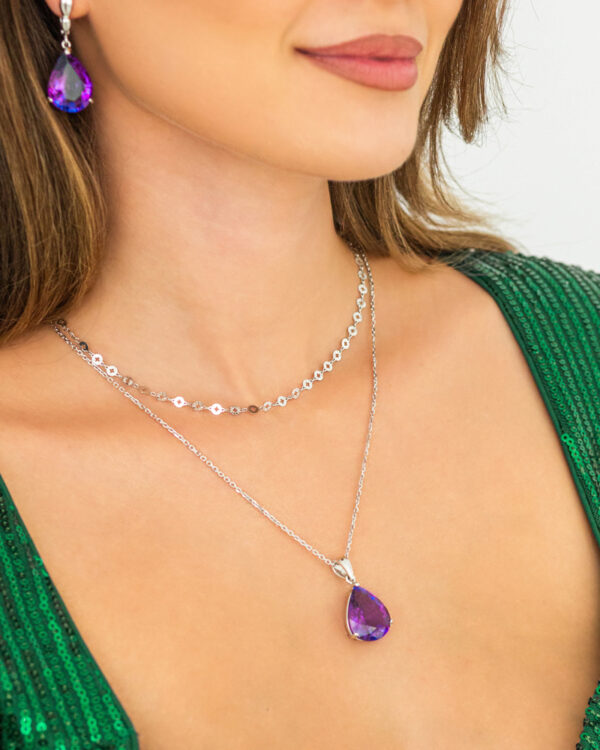 Unikatowa zawieszka z dużym ametystem przepięknie ozdobi dekolt podkreślając wyrazistość, elegancję oraz kobiecość Twojej kreacji. Ta niepowtarzalna precioza będzie idealnym uzupełnieniem Twojej kolekcji biżuterii. Zawieszka będzie przepięknie prezentowała się noszona samodzielnie, jak i w komplecie z kolczykami oraz pierścionkiem o podobnym wzorze dostępnymi w naszym sklepie.