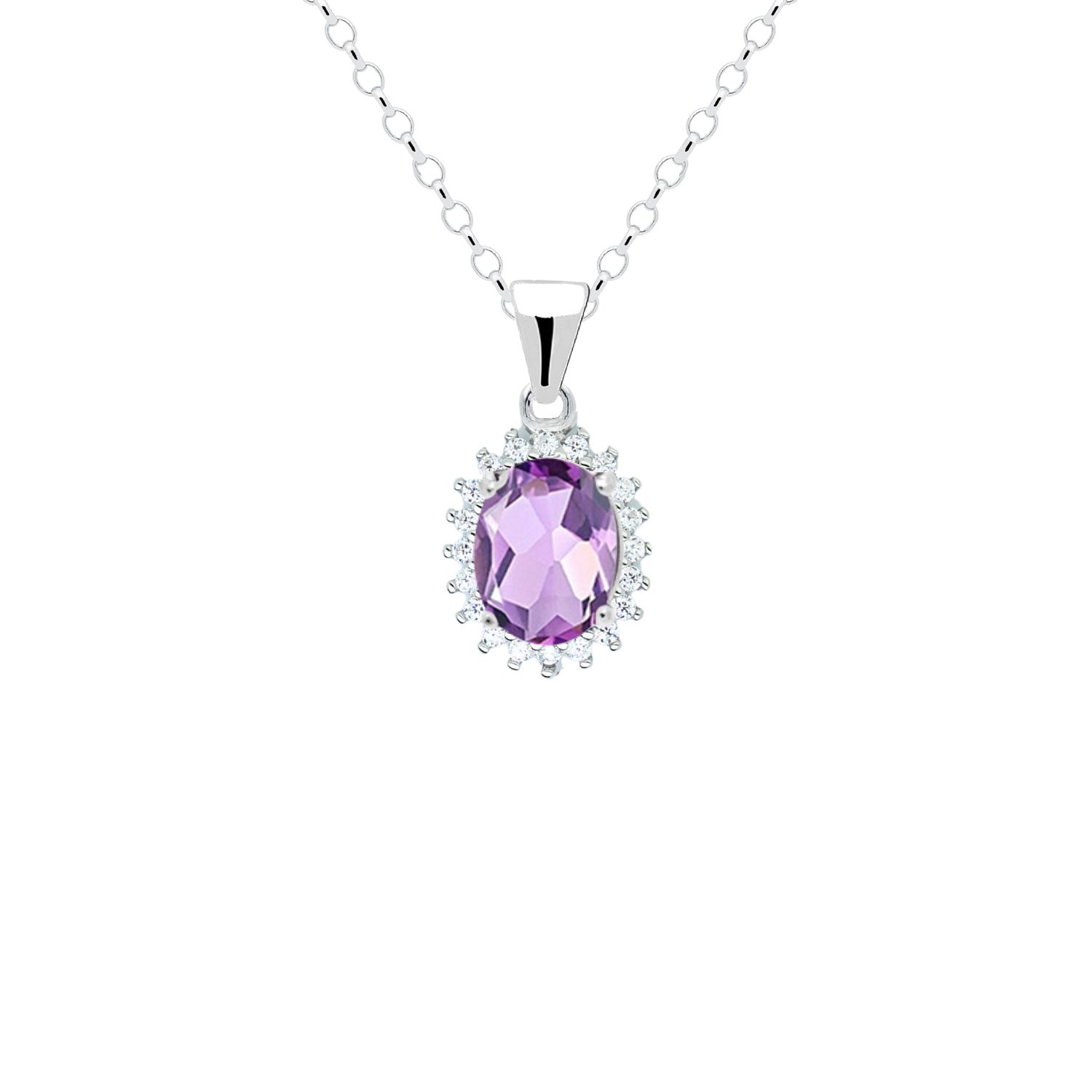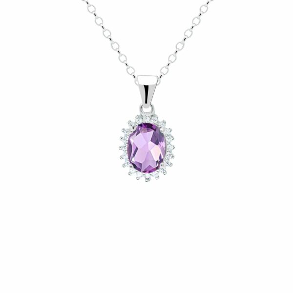 Wokół ametystu biegnie subtelne halo z drobnych, bezbarwnych kamieni o brylantowym szlifie, które tworzą owalną rozetę inspirowaną klasycznym wzornictwem jubilerskim. Taka forma dodaje zawieszce niezwykłej elegancji i ponadczasowego wdzięku, czyniąc ją idealnym akcentem zarówno na co dzień, jak i do wieczorowych stylizacji. Gładka, masywniejsza krawatka w kształcie delikatnie zwężającego się trapezu zapewnia harmonijne połączenie zawieszki z łańcuszkiem i stabilne ułożenie na dekolcie.