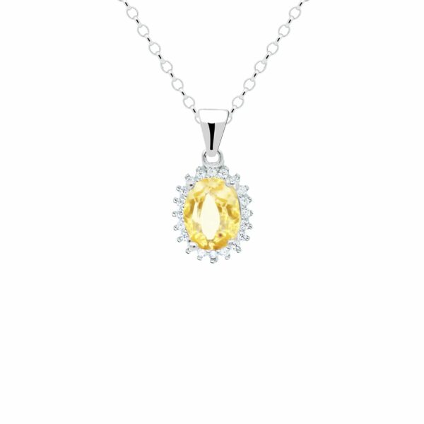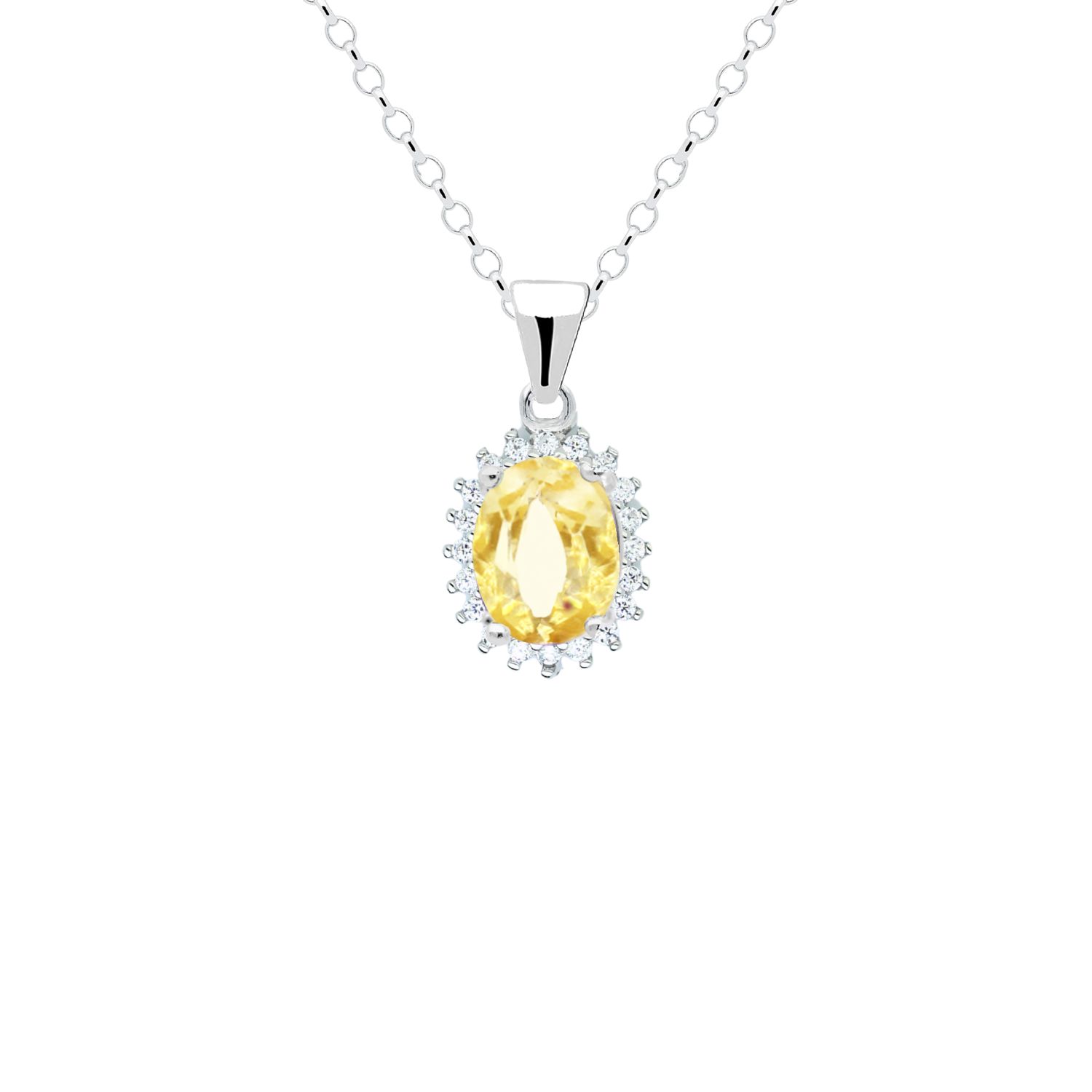 Elegancka zawieszka srebrna cytryn zachwyca owalnym, złocisto-żółtym cytrynem otoczonym subtelną aureolą błyszczących kamieni. Fasetowany szlif podkreśla świetlistość kamienia, a rodowane srebro 925 zapewnia trwałość i blask. To ponadczasowy dodatek idealny na co dzień i na wyjątkowe okazje, polecany również jako symboliczny prezent dla osób urodzonych w listopadzie.