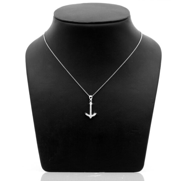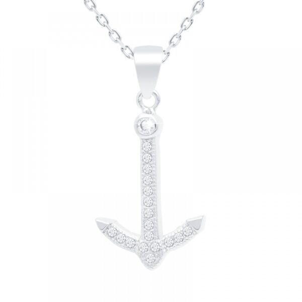 Zawieszka w kształcie kotwicy wykonana ze srebra uszlachetnionego rodem próby 925. Zawieszka ozdobiona białą cyrkonią. Wysokość zawieszki: 30 mm. Szerokość zawieszki: 15 mm. Bez łańcuszka.